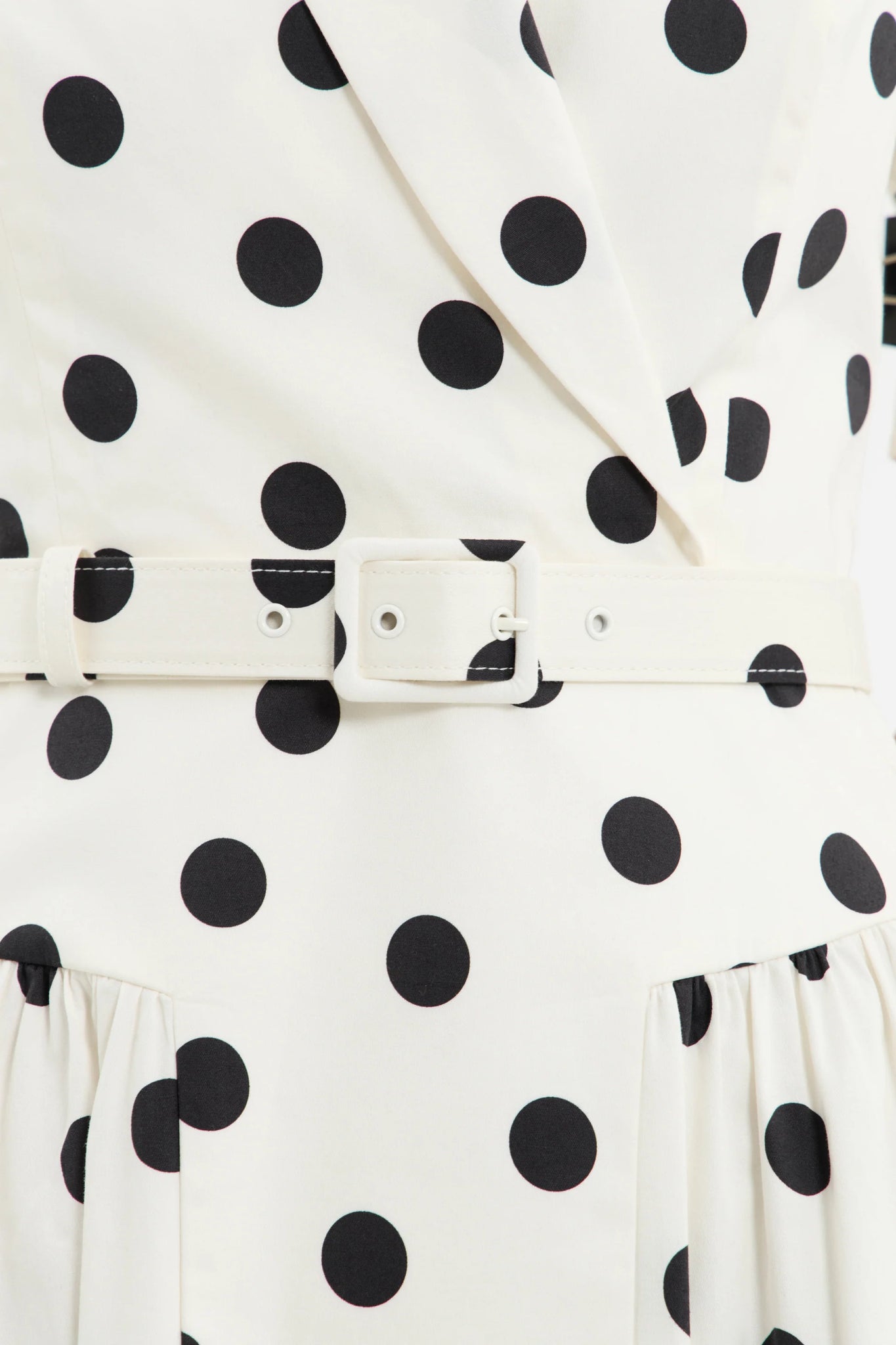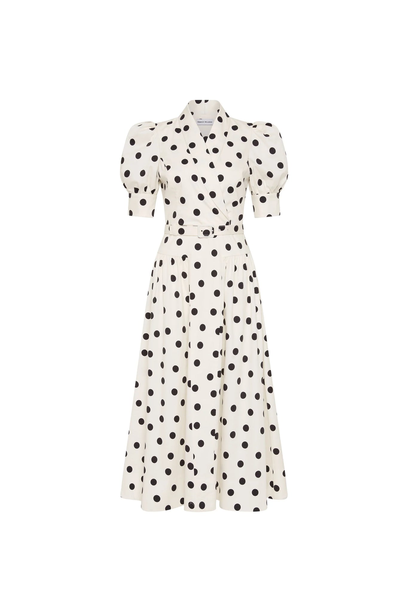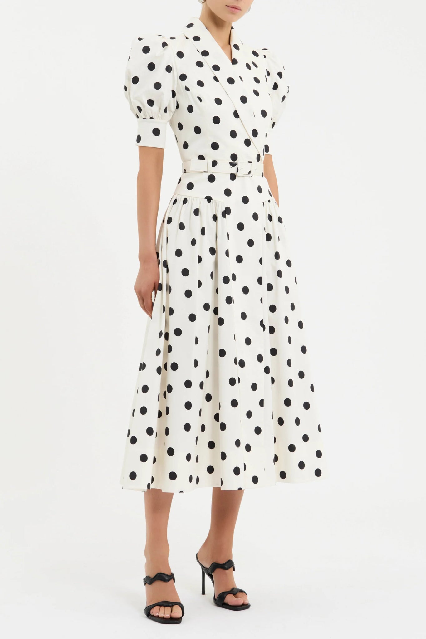 The Maisie Midi Dress blends timeless elegance with a chic monochrome polka dot print. Its short puff sleeves and V-neckline with a shawl lapel offer a sophisticated look, elevated by a drop waist, princess seams, and a self-belt to accentuate the flattering fit. The side-gathered midi skirt shapes an elegant silhouette, detailed with a front skirt yoke for added style. Lined and secured with a zip fastening at the back, this dress is perfectly versatile for both day and night events.
