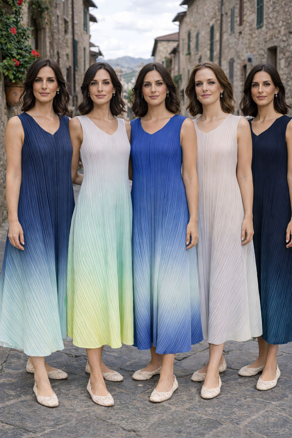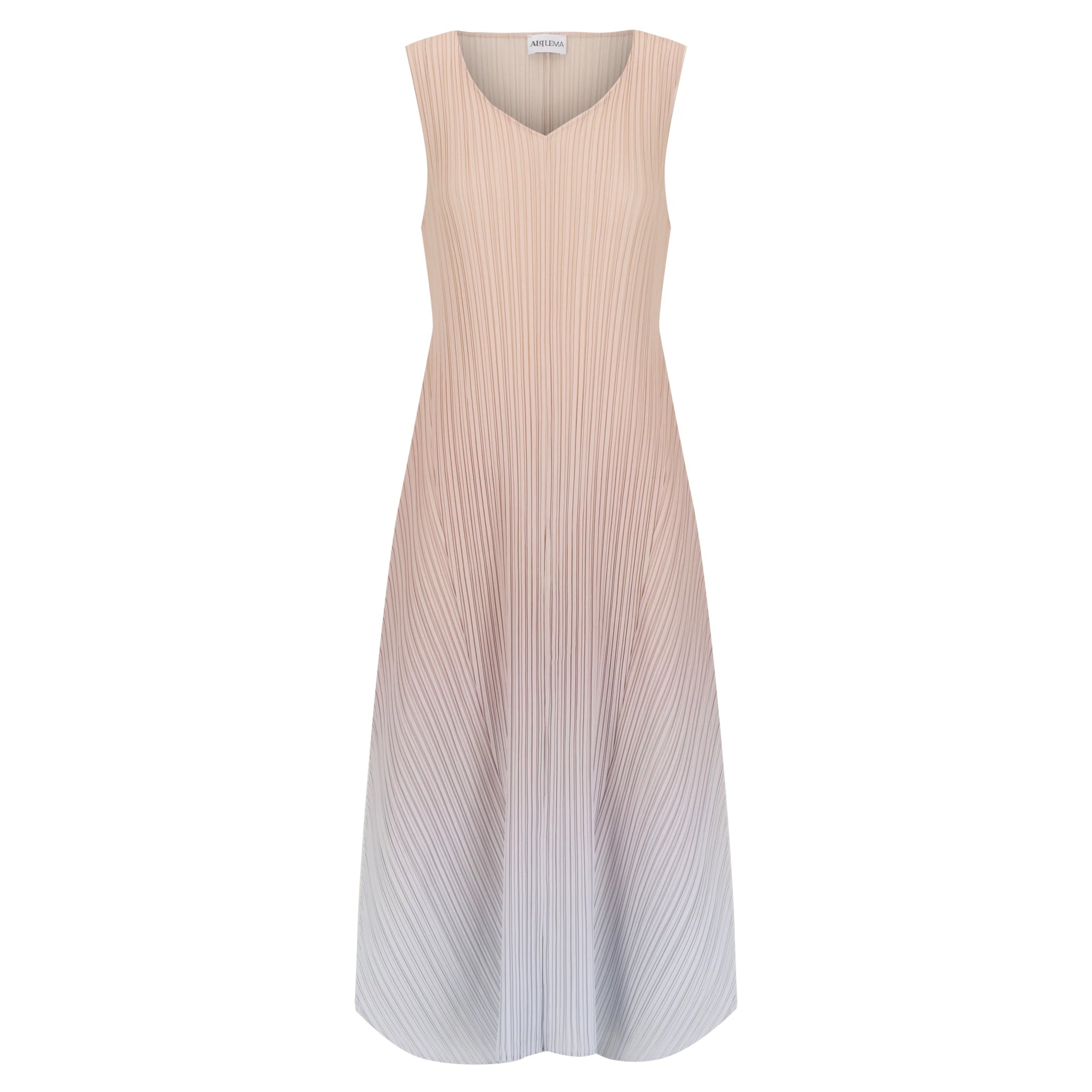 The Estrella Dress in Ombre is a luminous harmony of colour and form. Handcrafted with Alquema’s signature vertical pleating, this sleeveless silhouette features a subtle V-neckline and a slim-fitting bodice that gently flares into a full, flowing skirt. The ombré dye technique creates a seamless transition of tones, bringing movement and light to every fold.