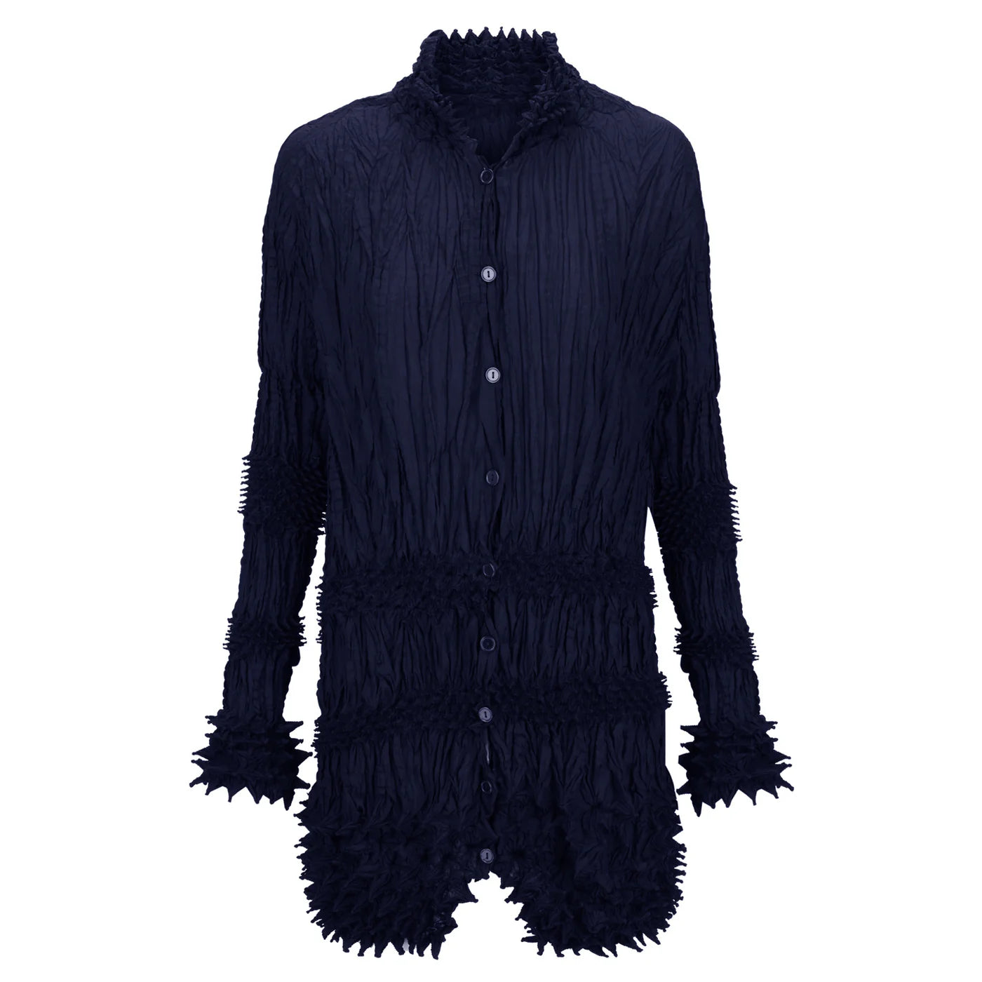 A celebration of texture and technique, the Urchin Top returns to the foundations of Alquema’s design language. Defined by sculptural shibori work and tactile surface texture, this long sleeve style balances structure with style. Soft volume through the body is contrasted with richly textured panels, creating a dimensional silhouette that feels considered from every angle. Finished with a button-through front, it can be worn as a top or styled open as a lightweight layer.