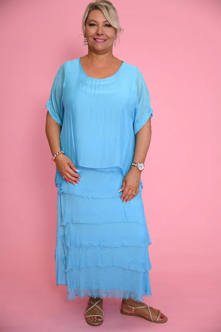 Featuring a thoughtfully designed tiered skirt with a unique textural element where the side tiers don't meet, this dress offers both visual interest and practical flexibility for comfortable movement. The viscose slip provides a comfortable and stretchy foundation, accommodating up to an AU 20/22.