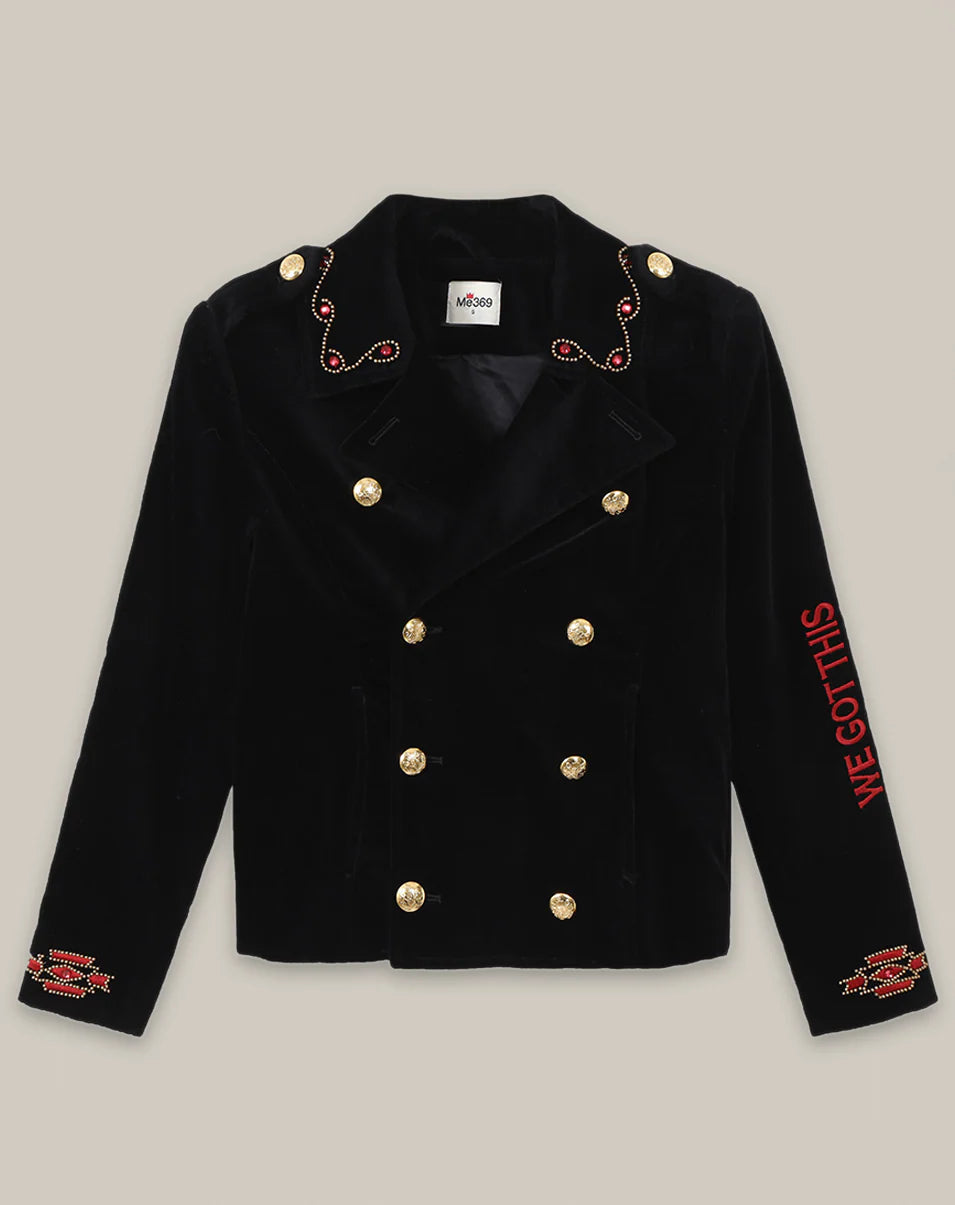100% Cotton. Double breasted fitted long sleeve jacket with wide collar and lapels. Four buttons on each sleeve. One sleeve reads “WE GOT THIS”. Back has a beautiful horse logo and reads “YOU AND ME” at the top and “ROYAL LOVE” on the bottom.