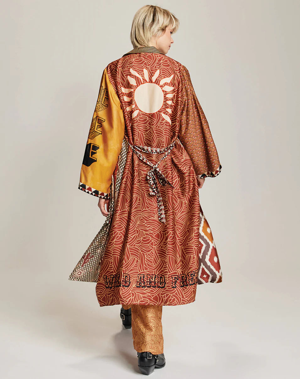 Our Nova Kimono dress is midi length, button down with a sash tie. Sleeves are long and loose. V-neck with collar and lapels. Front pocket. Lovely over our Lydia pants for an exotic feminine look.