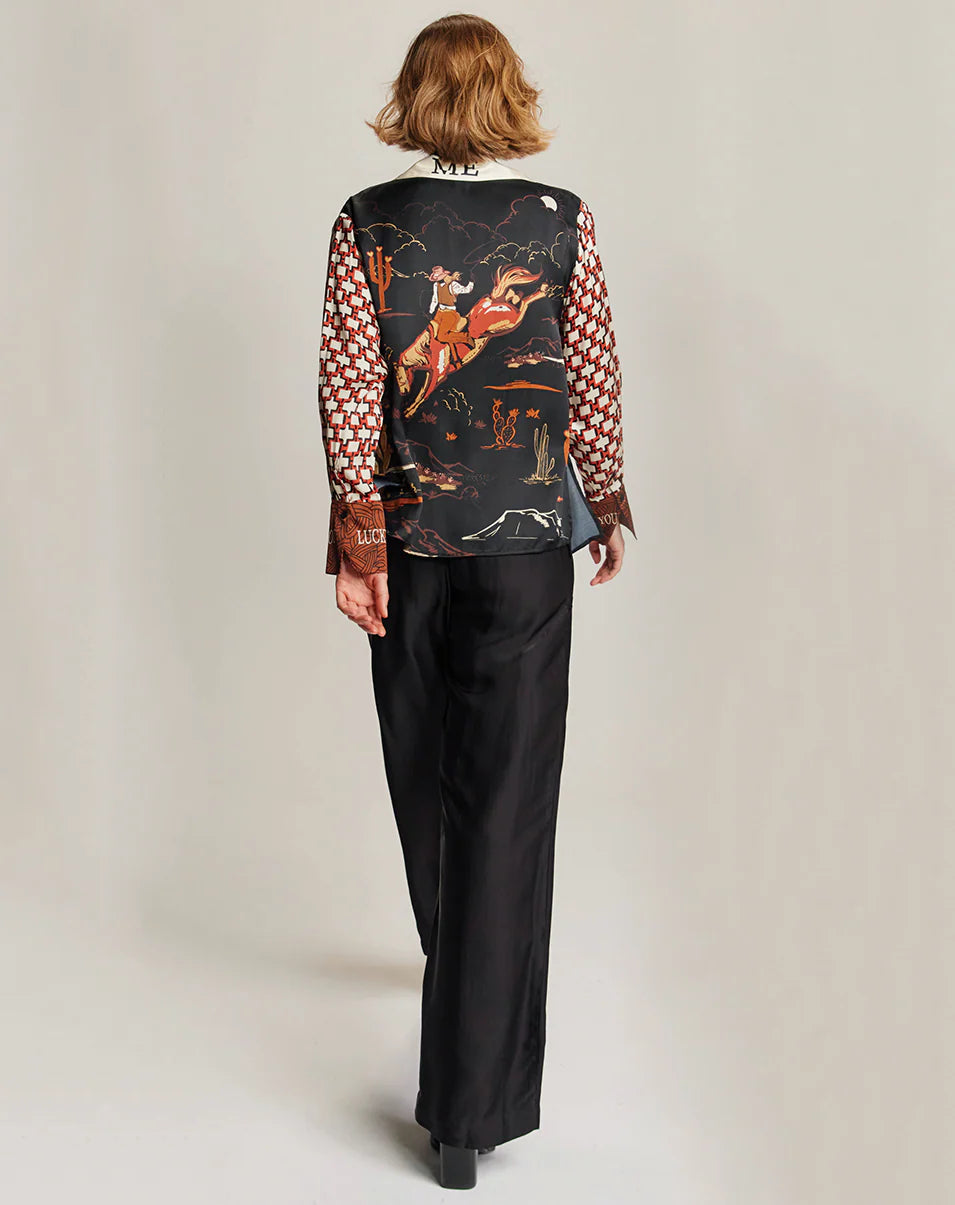 100% Viscose. Reyna tie waist shirt is available in our Rodeo pattern. Front of shirt ties at waist over the shirt. Button down, collar, long sleeves with contrasting cuffs. Each part of the shirt is a different print. Front has a tie dye feel. Back has a bucking bronco in the deseret. Sleeves are small check. Cuffs read “LUCKY ME”. Pair with our Savannah pants for an elegant, artistic look.