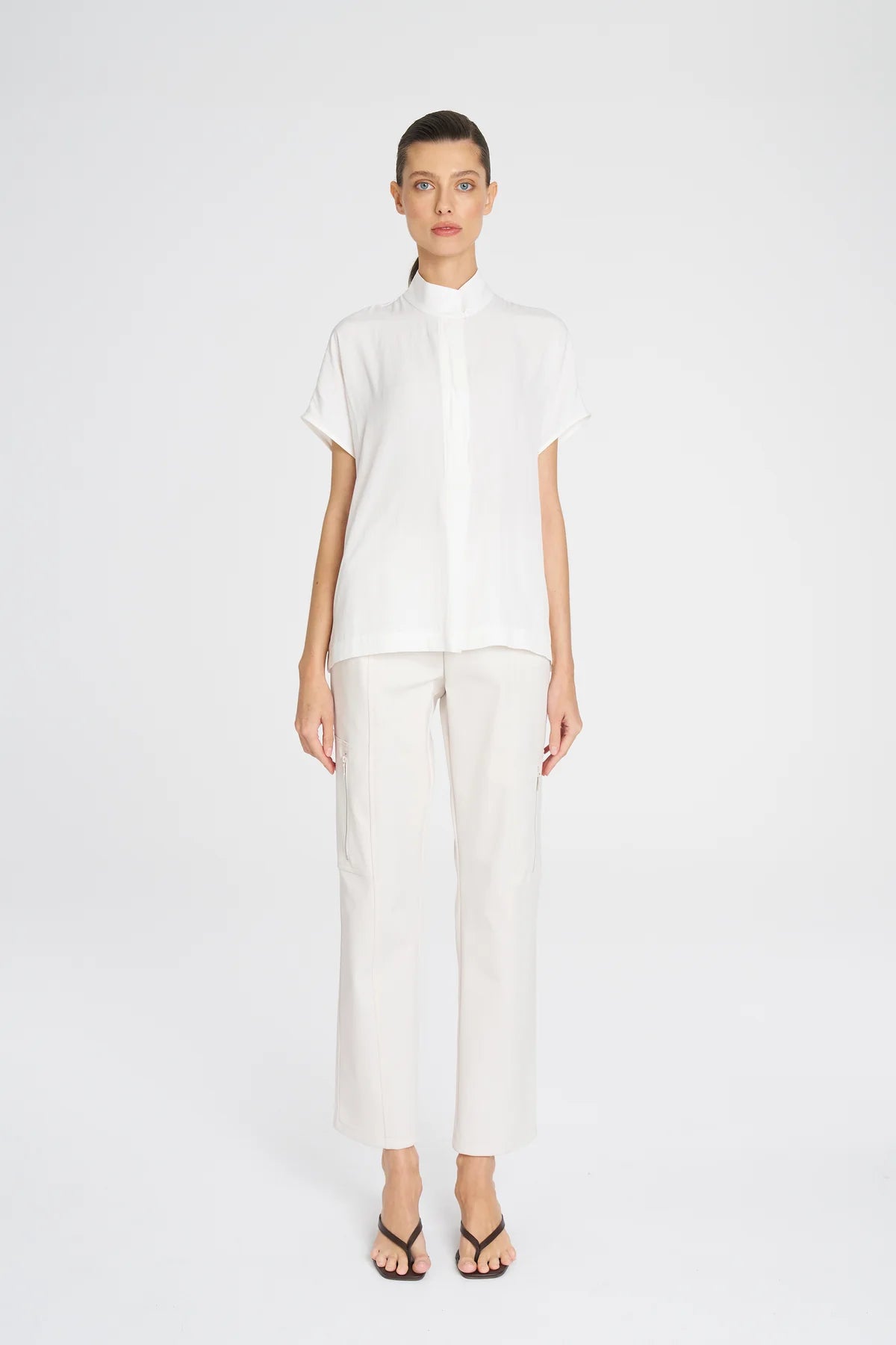Crafted from Mela Purdie's Mache, featuring a relaxed fluidity & smooth lustre surface. The Funnel Shell is a versatile piece, featuring a funnel collar, and a button closure at the neck.
