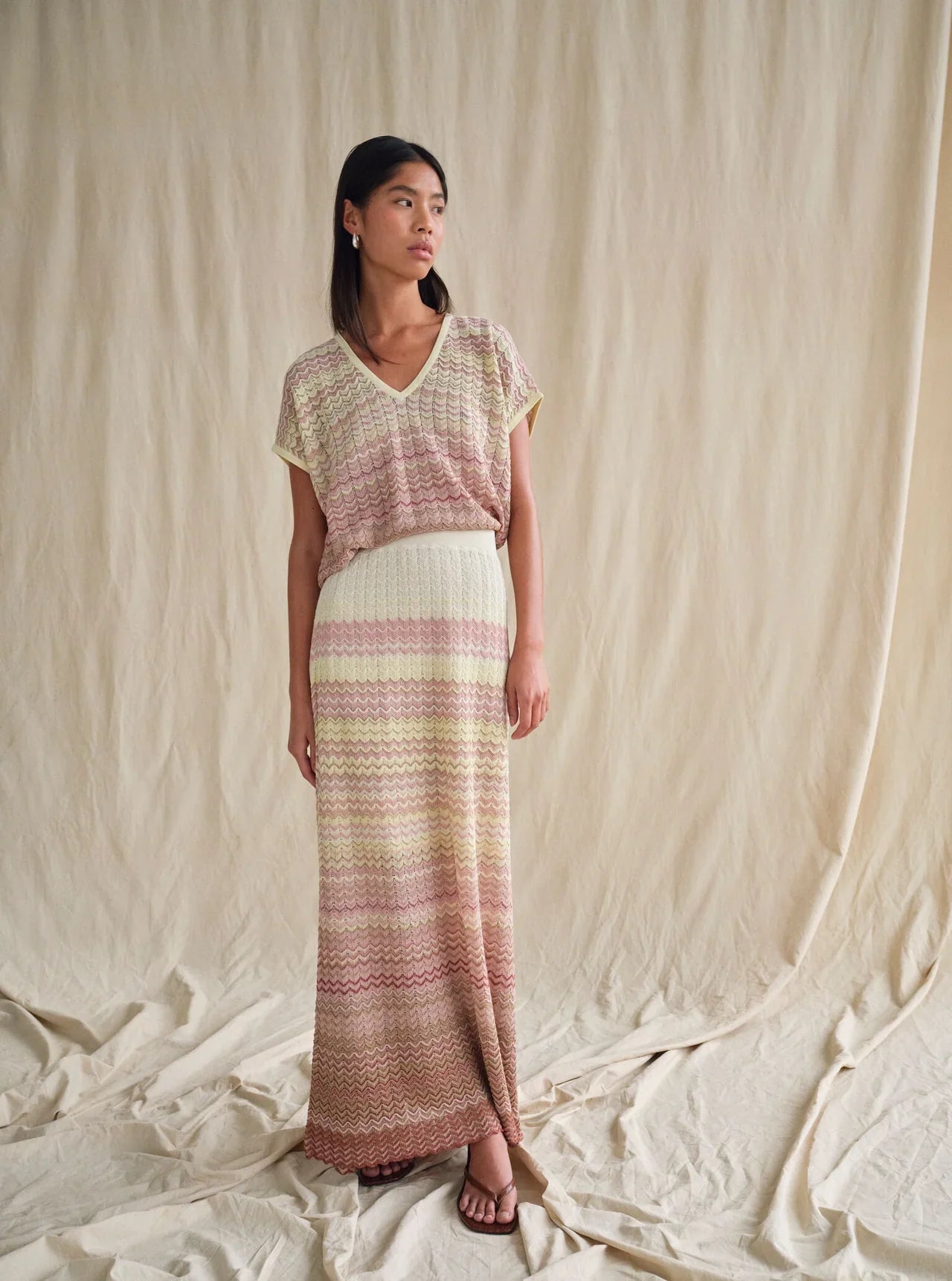 This chic top is designed in a relaxed fit, exuding effortless elegance. Featuring an intricate fine-knit zigzag pattern in soft powder pink, cream, and beige hues, it creates a harmonious and feminine palette. The flattering V-neckline enhances its silhouette, while the lightweight fabric drapes beautifully, ensuring both comfort and style. Subtle hints of shimmery lurex threads add a touch of glamour, catching the light with every movement. Pair it with the matching skirt for a polished, coordinated ensemble, or style it with classic jeans for an effortlessly stylish everyday look.