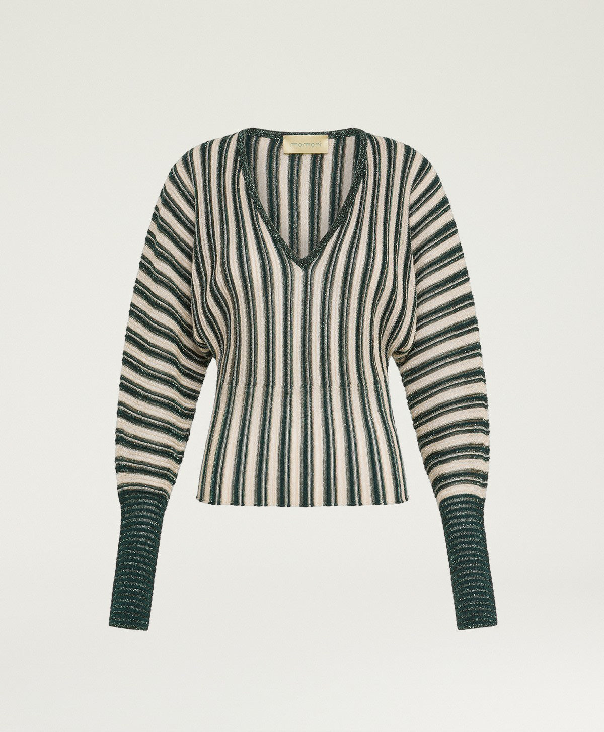 Seamless long batwing sleeve V neck top knitted in multistripe lurex. Basil features a feminine bodice and wide sheath-effect ribbed cuffs. Made in Italy.