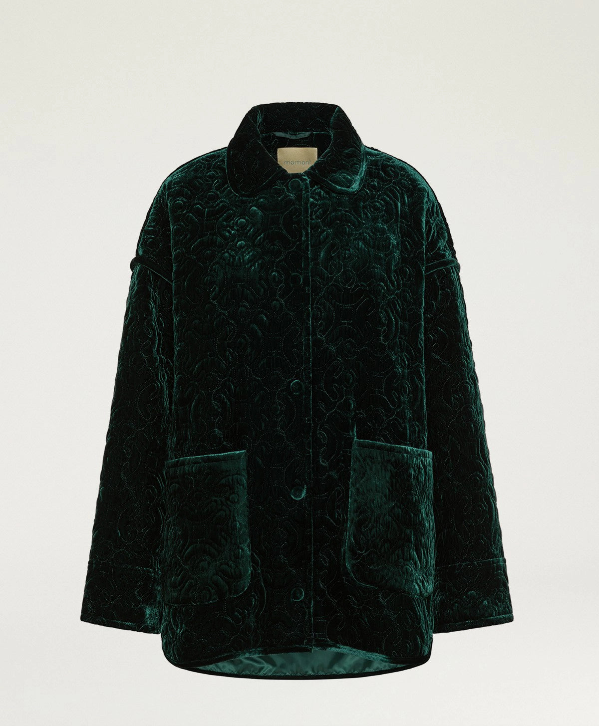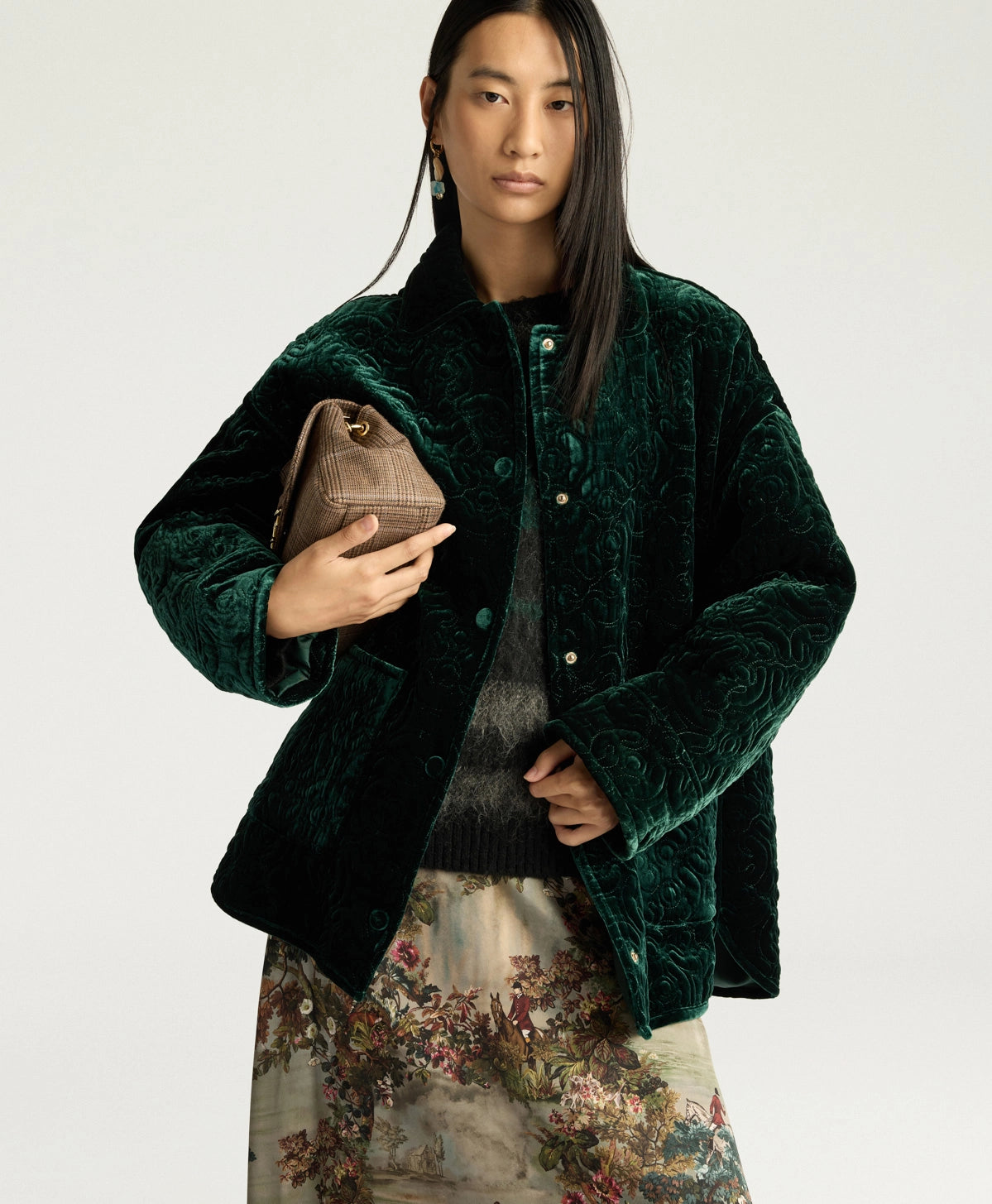 BOTANICAL COAT IN QUILTED VELVET - BOTTLE GREEN