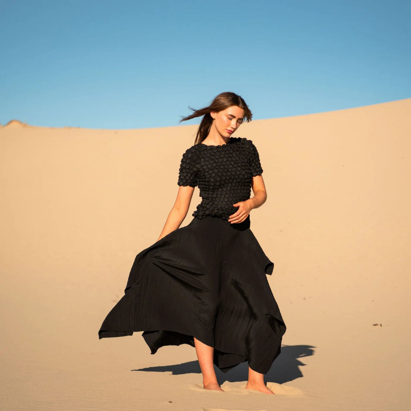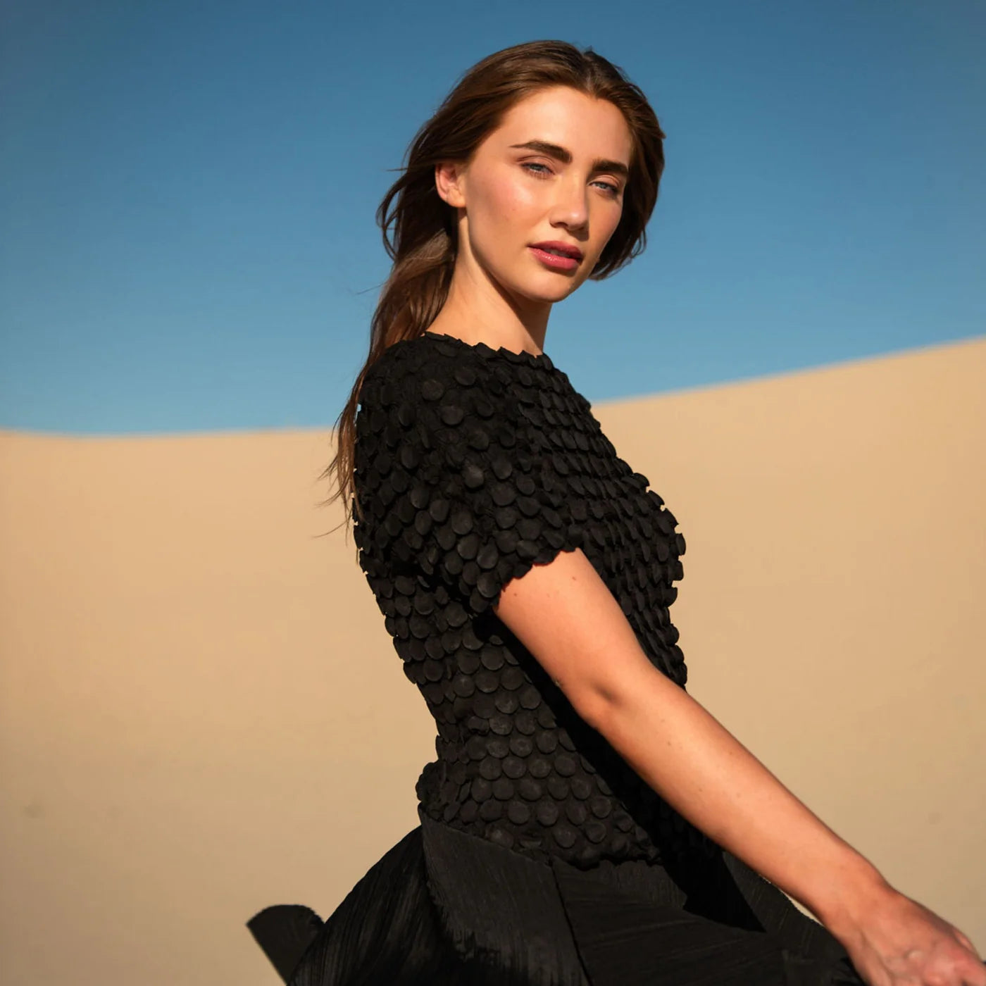 The Bubble Top is a statement piece defined by texture. Crafted in Alquema’s distinctive pleating, in a new circular pressed pleat. This luxe top is finished with hundreds of small, coin-like bubbles that create dimension and movement from every angle.