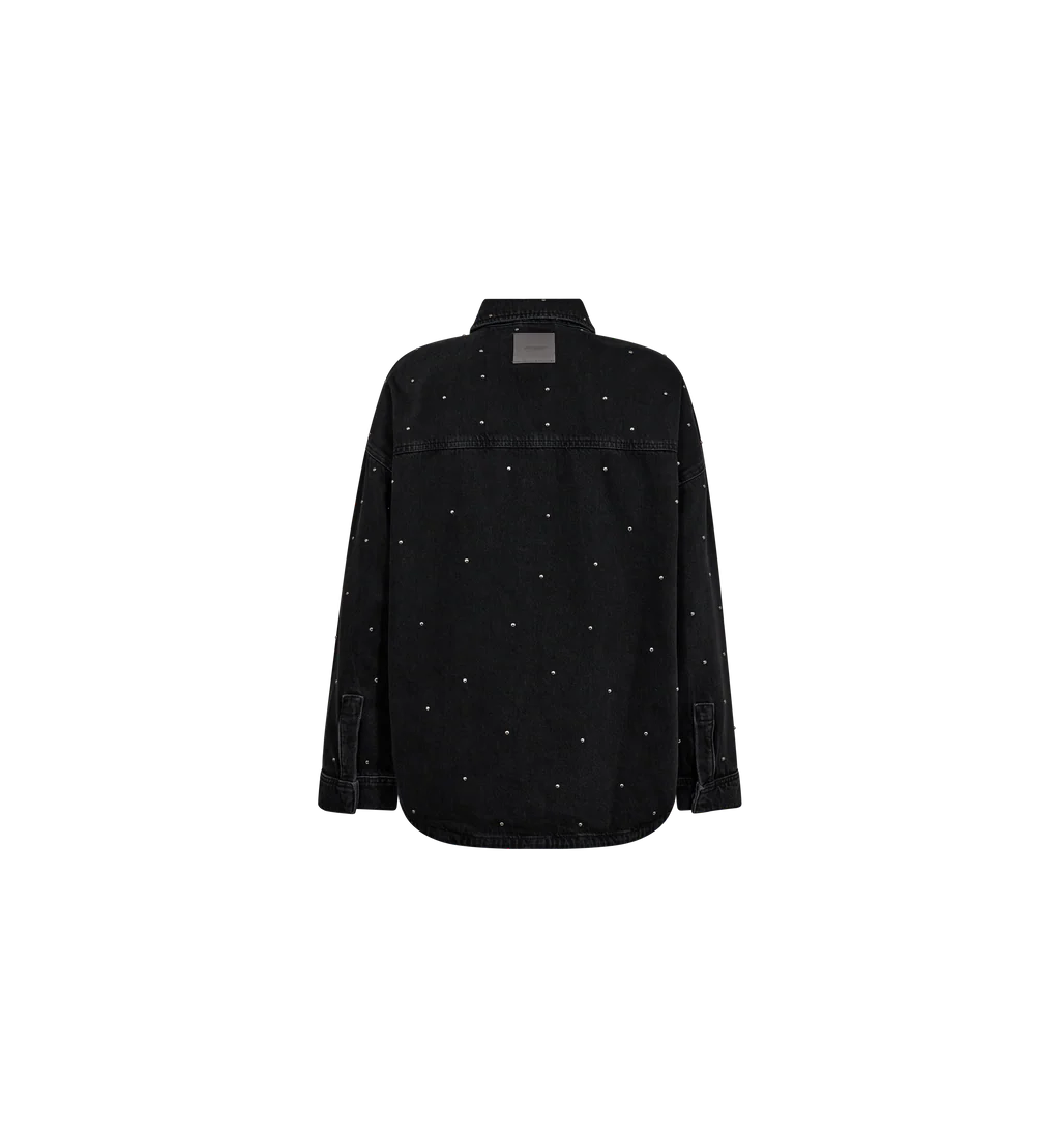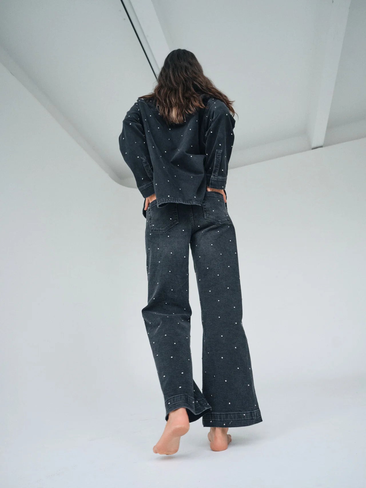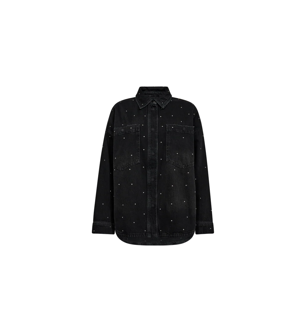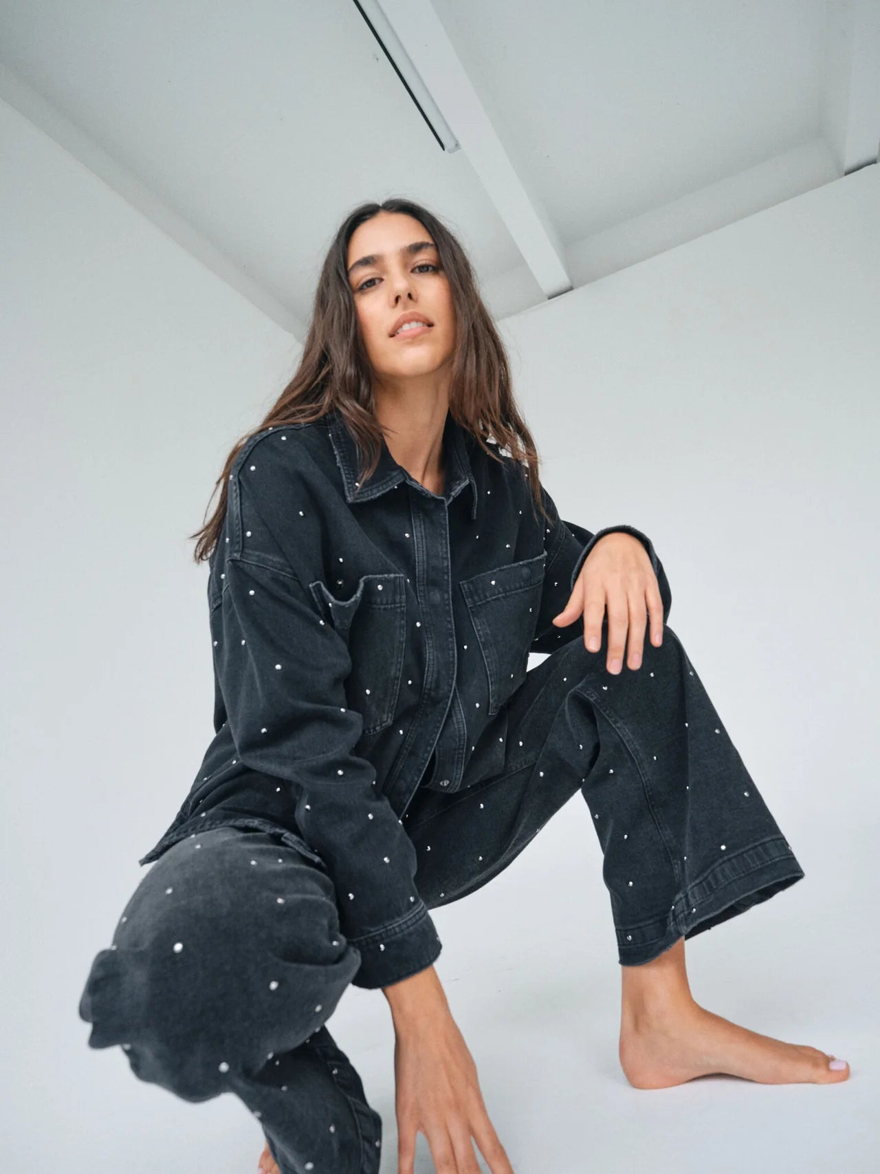 This standout denim shirt is designed to make a statement with its relaxed fit and eye-catching details. Featuring large front pockets, a rounded hem, and a concealed button closure, it blends casual coolness with a touch of glam. Adorned with all-over shiny stones, it’s perfect for layering as an overshirt or wearing buttoned up with matching vintage-wash jeans for a bold denim-on-denim look.