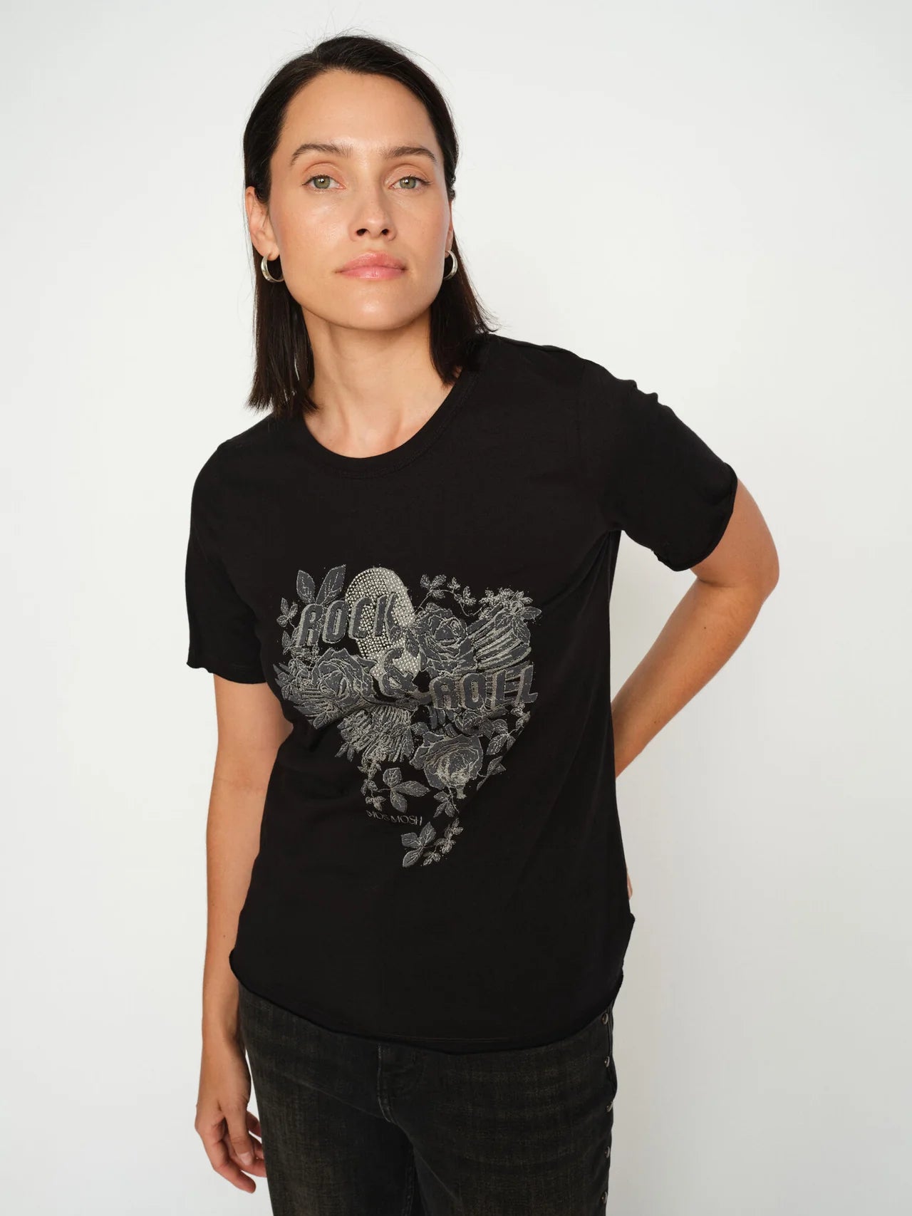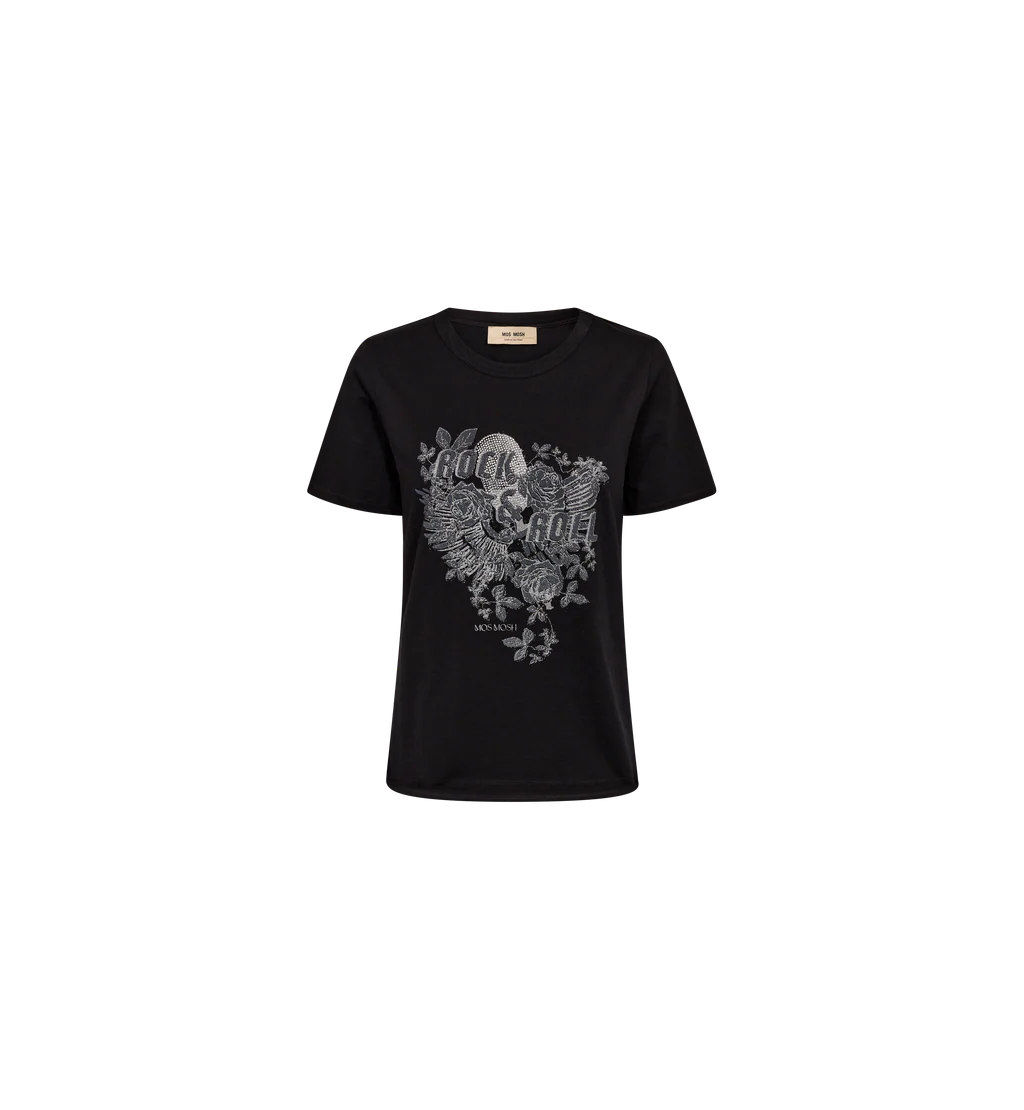 This graphic tee brings bold attitude with a feminine twist. Crafted from soft cotton in a flattering regular fit, it features a striking "Rock & Roll" motif embellished with shimmering studs and floral artwork for that perfect blend of edge and elegance. Wear it with jeans for a cool everyday look or tuck it into tailored pants to add a rebellious vibe to your outfit. A true MOS MOSH signature piece — made to stand out.