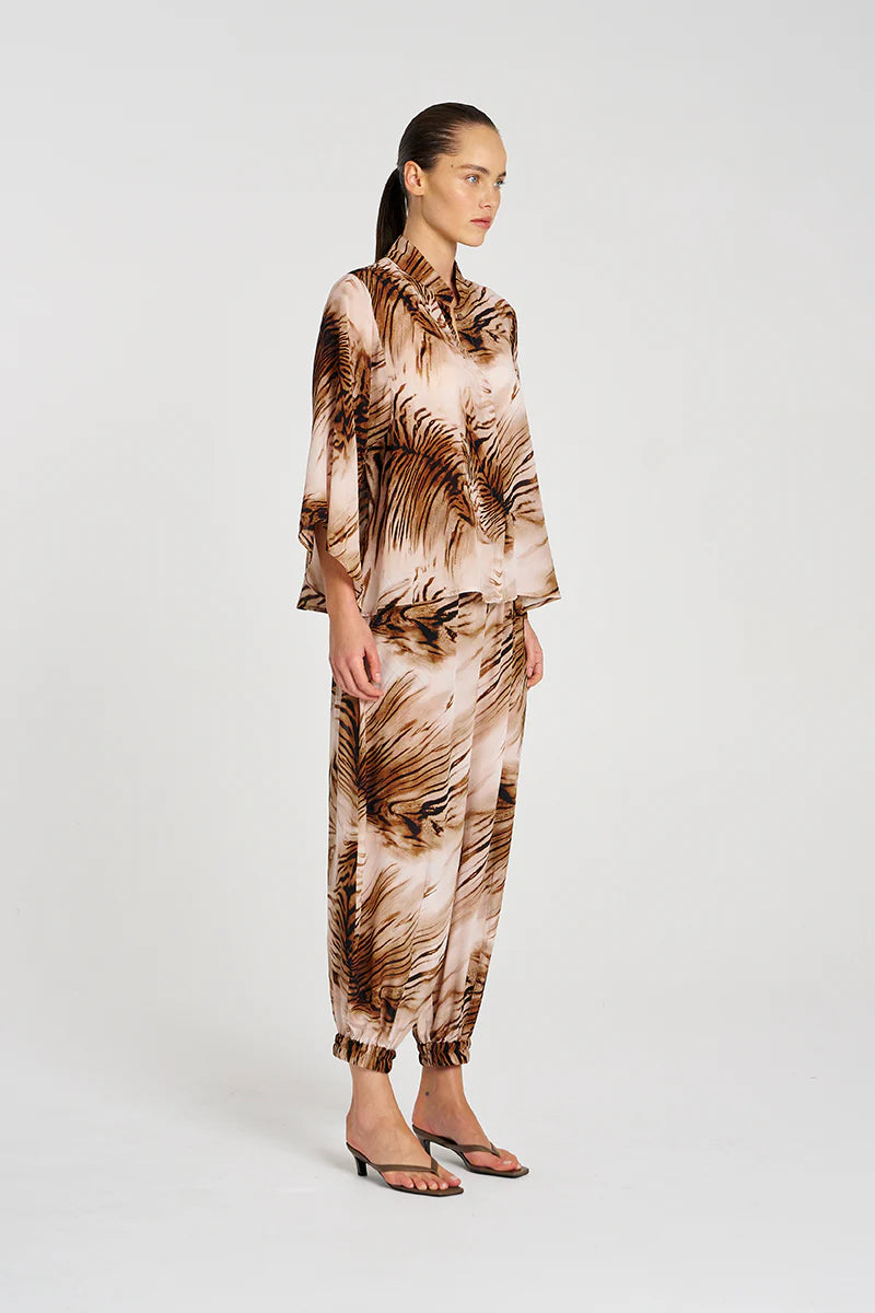 Crafted in Mela Purdie's mid-weight, soft washed Silk Crepe De Chine, featuring the bold  Silk Tiger Print. The Fezz Shirtis an elevated piece, featuring fluid batwing sleeves and a stand collar.