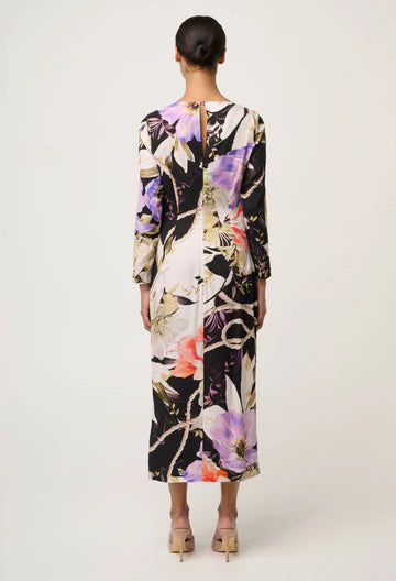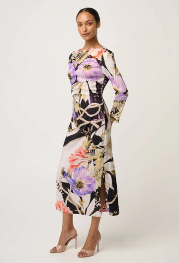 The Tangled Blossom print features oversized florals in soft lilac, blush, ivory and coral tones, interwoven with subtle rope detailing against a dramatic dark base—creating depth, movement and visual intrigue. A figure-skimming fit and midi length elongate the body, while a side split adds ease of movement and a hint of allure.