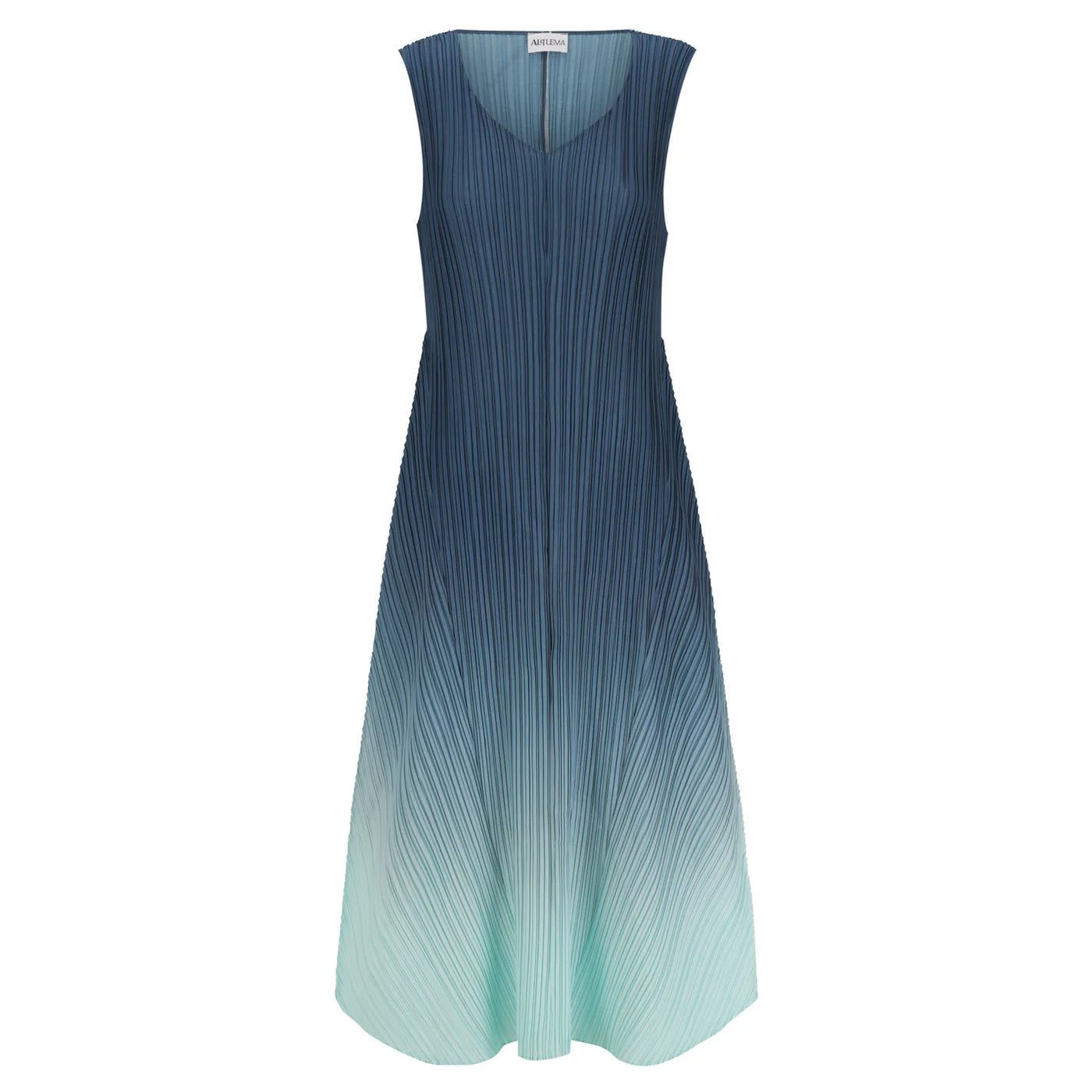 The Estrella Dress in Ombre is a luminous harmony of colour and form. Handcrafted with Alquema’s signature vertical pleating, this sleeveless silhouette features a subtle V-neckline and a slim-fitting bodice that gently flares into a full, flowing skirt. The ombré dye technique creates a seamless transition of tones, bringing movement and light to every fold.