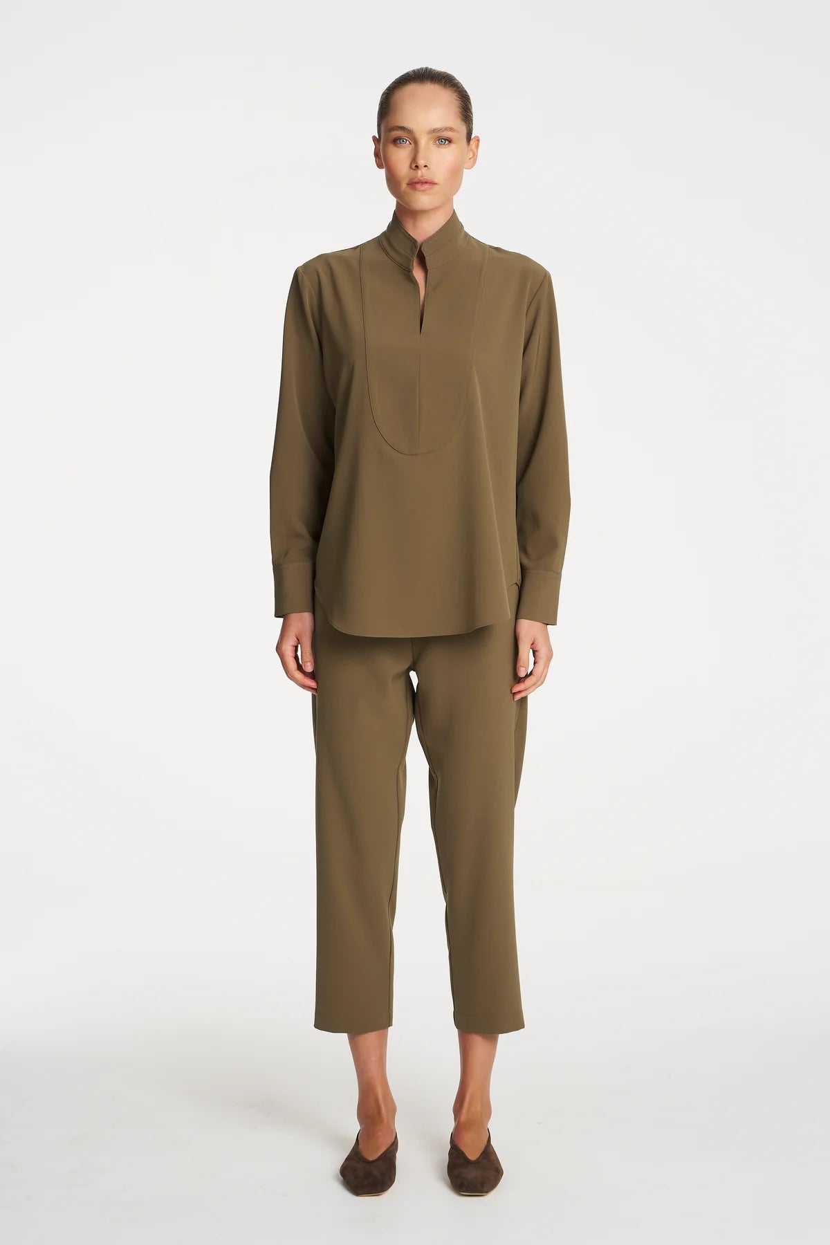 Crafted from Mela Purdie's Flex Weave, a minimalist twill weave with a smooth matte finish. The Tapered Flat Pant is an easy wearing pant, featuring a tapered fit, slightly cropped length and a firm flat front waistband.