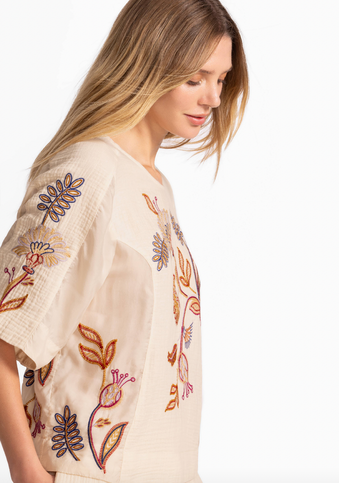 Crafted from breathable 100% cotton, the Gineva Mixed Media Dolman Blouse is adorned with vibrant floral embroidered details. Featuring a curved neckline and a keyhole back, this relaxed-fit top is finished with a series of princess seams with panels of different materials for added texture. Pair with relaxed-fit denim and coordinating flats for lunch date