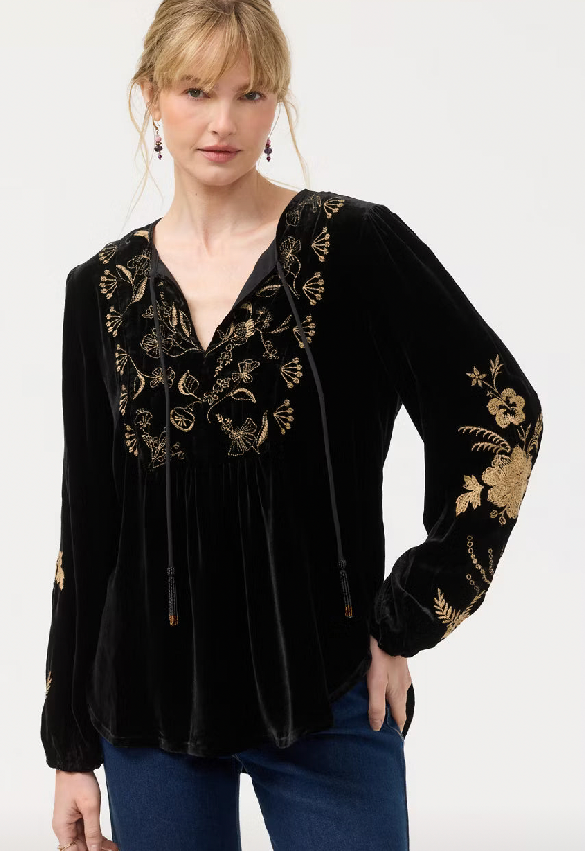 Crafted from a rich silk blend, the Velvet Prairie Blouse shimmers with intricate gold embroidery that highlights its rich texture. A split V-neckline with gathered yoke detailing frames the silhouette, while softly puffed bishop sleeves add graceful volume. Style with metallic trousers and strappy heels for a refined evening statement.