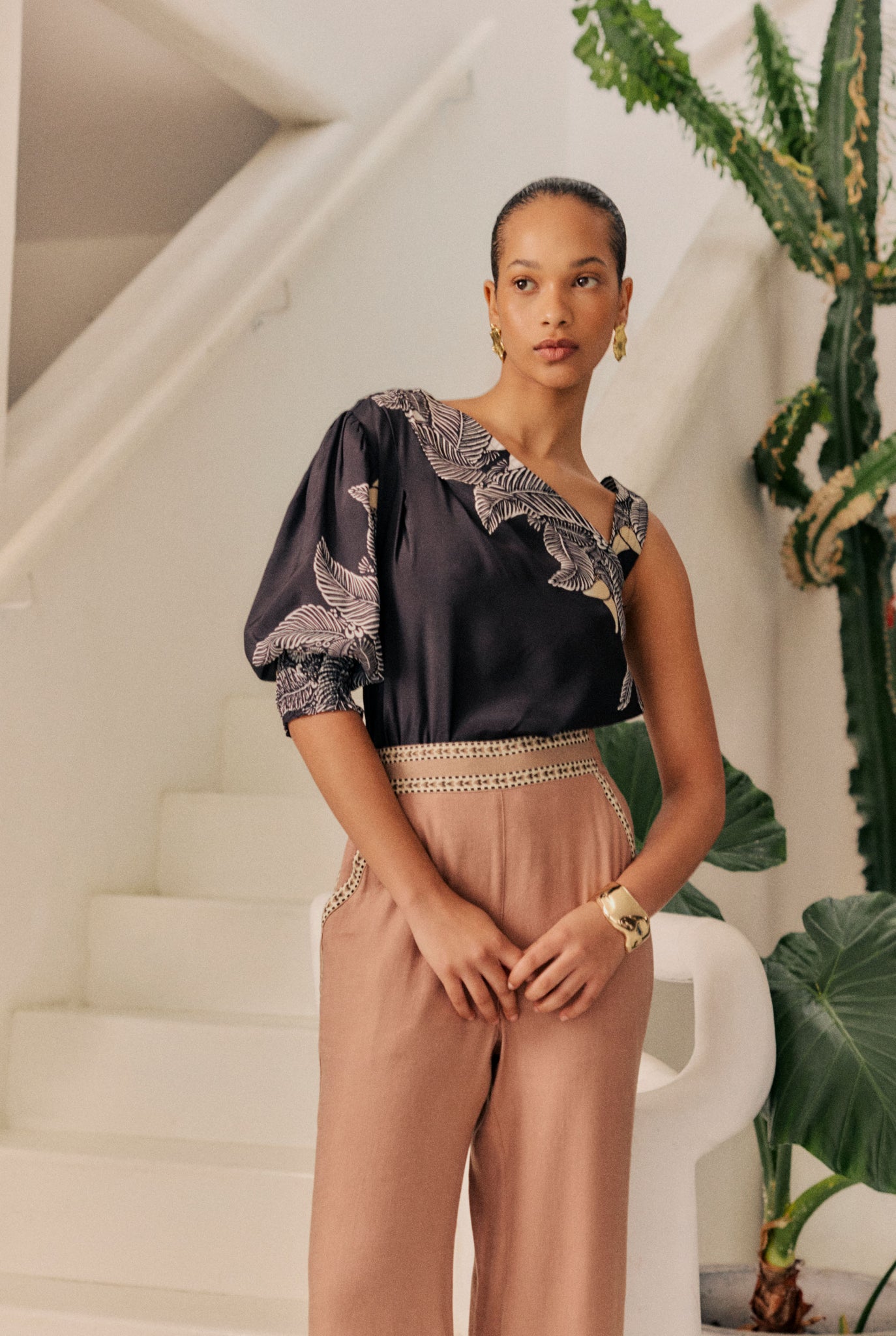 The Tahani Onesleeve Top features a striking asymmetrical design with a single sleeve placement that creates modern, directional style. Crafted from soft viscose, this piece drapes beautifully and offers breathable comfort for everyday wear. The one-sleeve silhouette makes a bold fashion statement while remaining versatile enough to transition from casual to elevated occasions. Perfect for those seeking contemporary design with an unexpected twist.