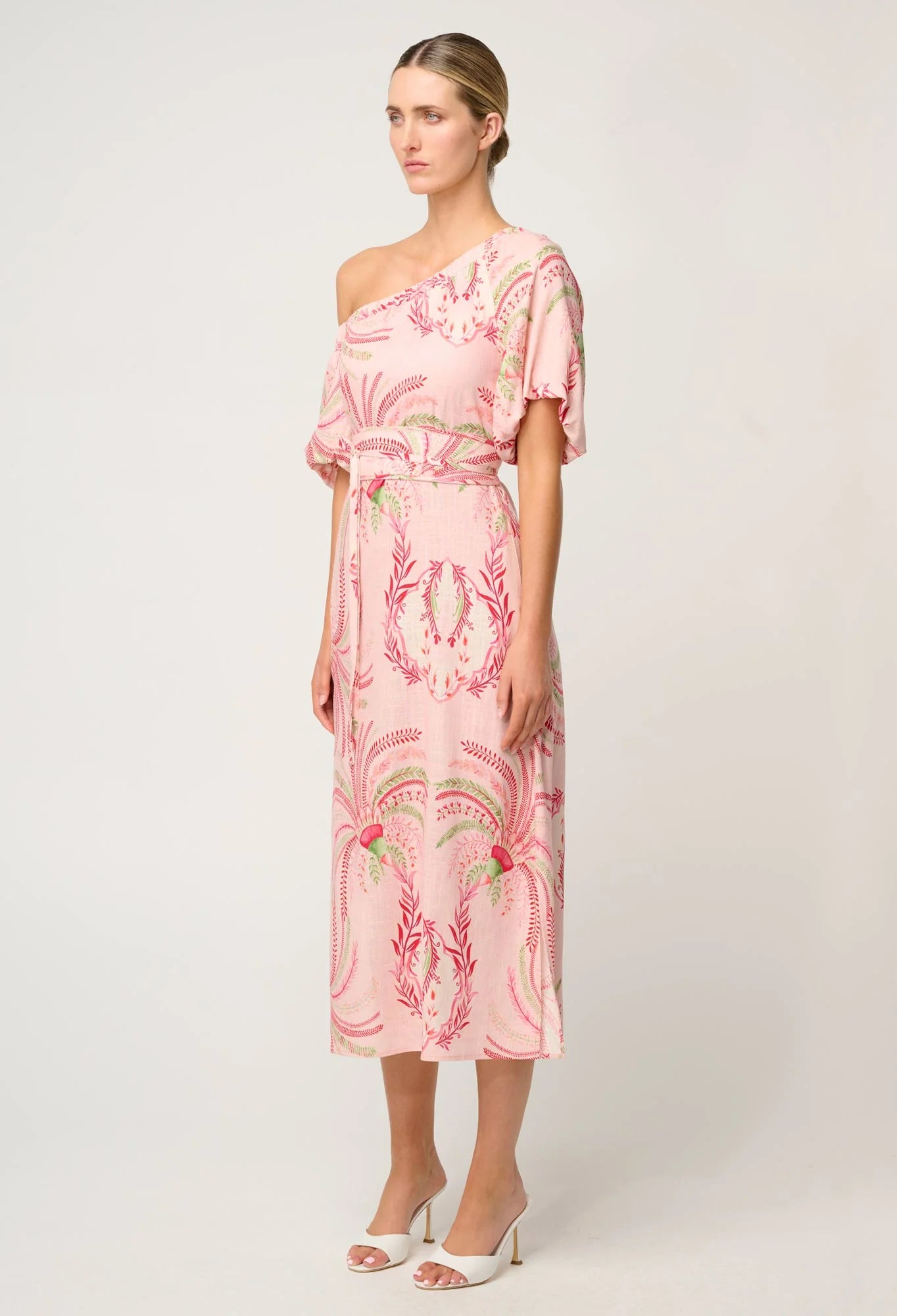 The soft Palmarosa hue is enhanced with intricate embroidered detailing, inspired by botanical motifs in romantic pink and green tones. The one-shoulder neckline and voluminous short sleeve create a striking asymmetric look, while the cinched waist flatters your figure and leads into a gracefully flowing midi-length skirt.